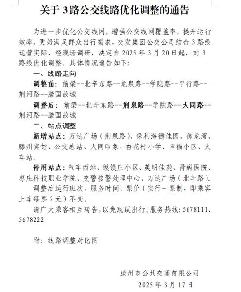 關(guān)于3路公交線路優(yōu)化調(diào)整的通告