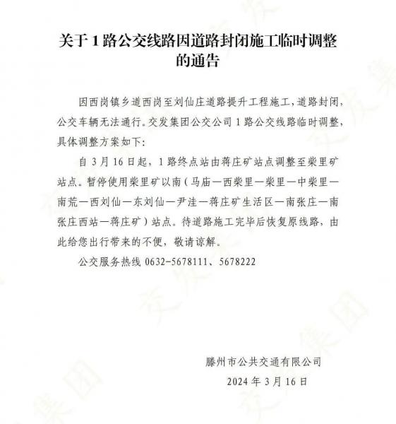 關(guān)于1路公交線路因道路封閉施工臨時(shí)調(diào)整的通告